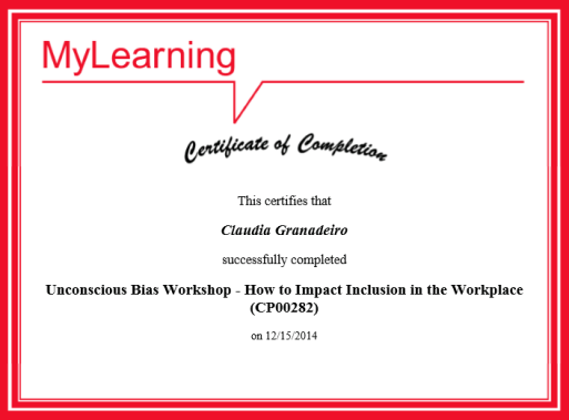 Unconscious Bias Workshop: How to Impact Inclusion in the Workplace – 2014 Previous Next Publicado noviembre 2, 2015 en 705 × 522 en Diplomas Unconscious Bias Workshop: How to Impact Inclusion in the Workplace – 2014 Me gusta Cargando...